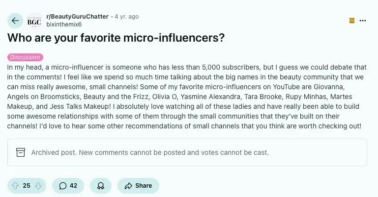 On Reddit, for example, users frequently recommend their favorite YouTubers, TikTokers, or Instagram creators in niche subreddits.